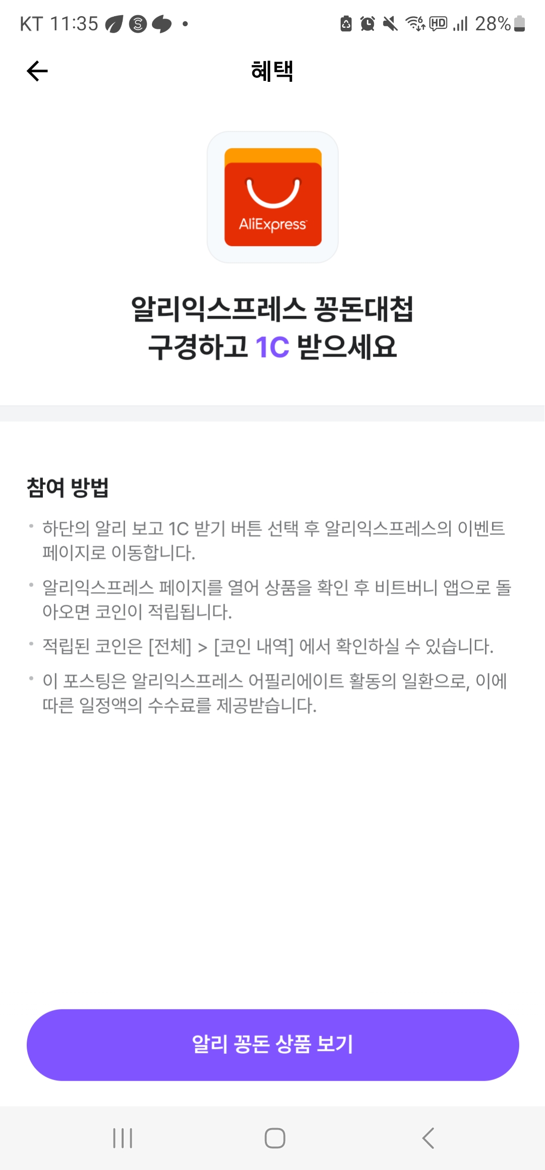 하단의 알리 보고 1C 받기 버튼 선택후 알리익스프레스의 이벤트 페이지로 이동하면서